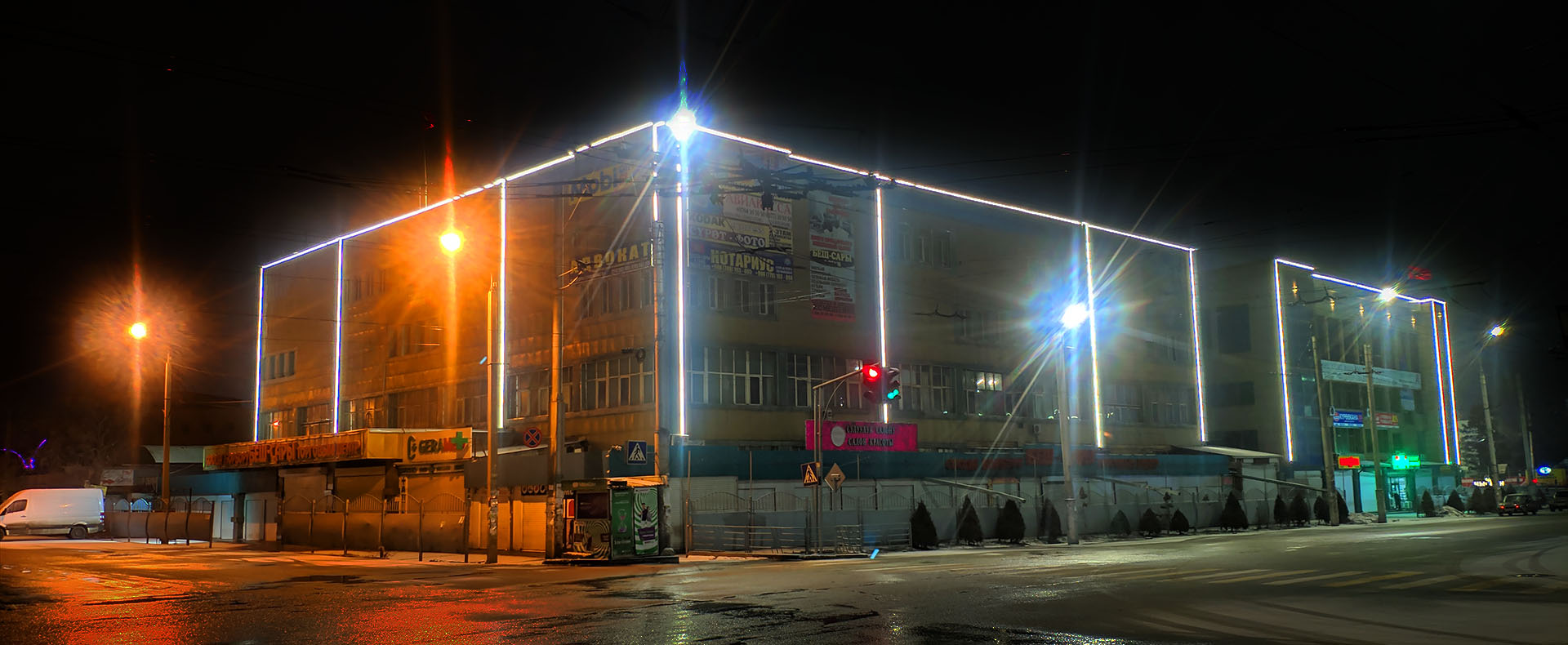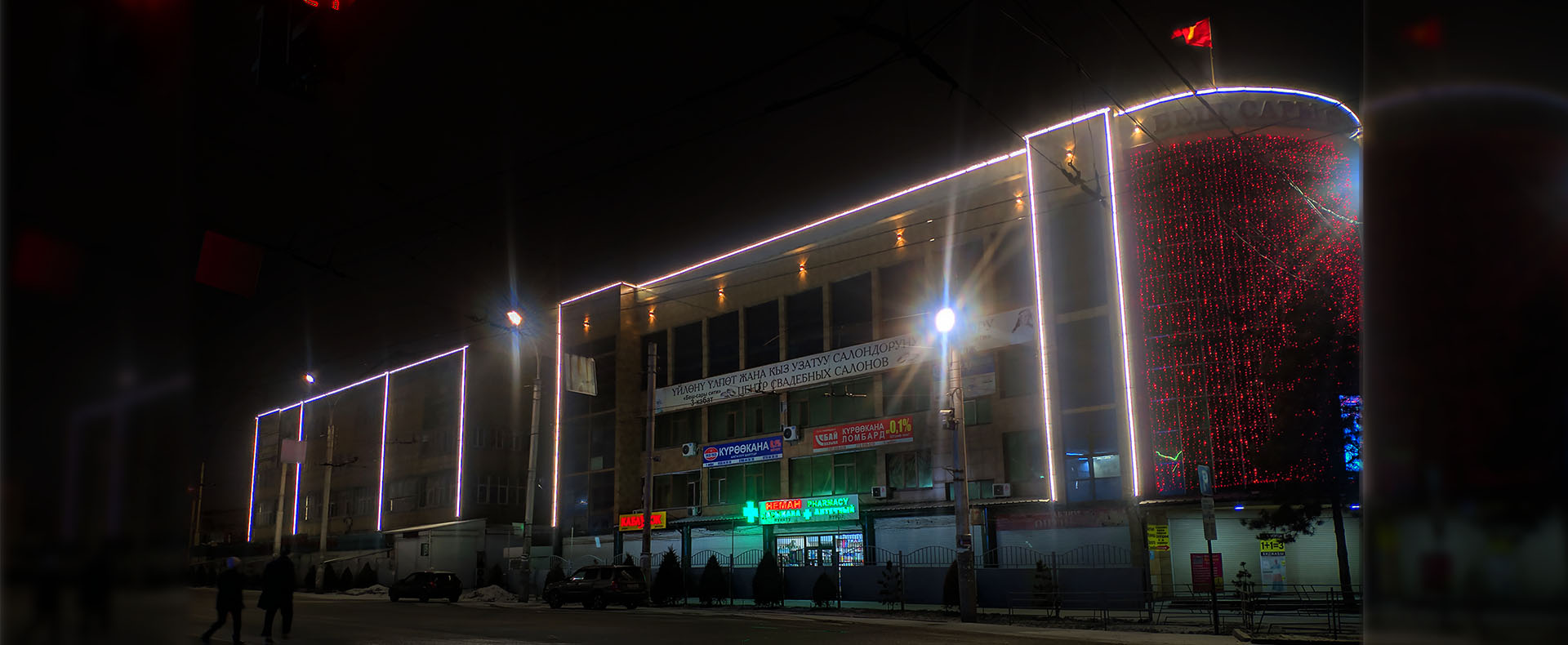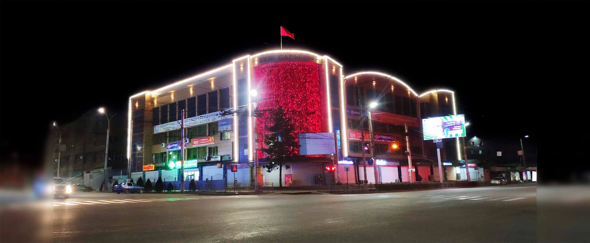Специалистами нашей компании было произведено декоративное оформление здания ТЦ «Беш Сары City» в г. Бишкек по ул. Бейшеналиева, 42а. Линейная подсветка в сочетании с гирляндами и настенными архитектурными светильниками создали прекрасный ночной вид, издалека привлекающий взоры горожан и гостей столицы.