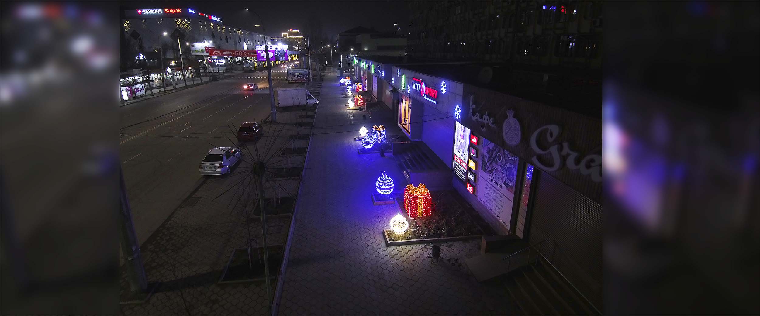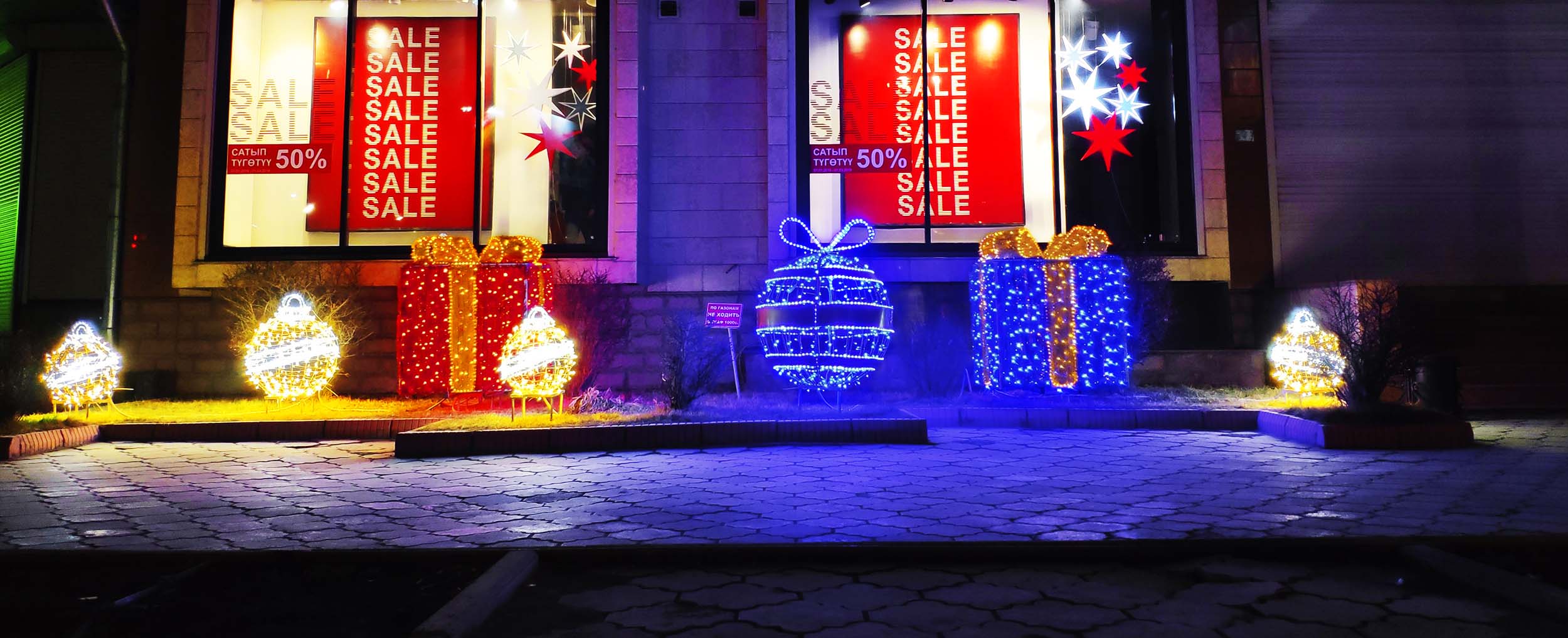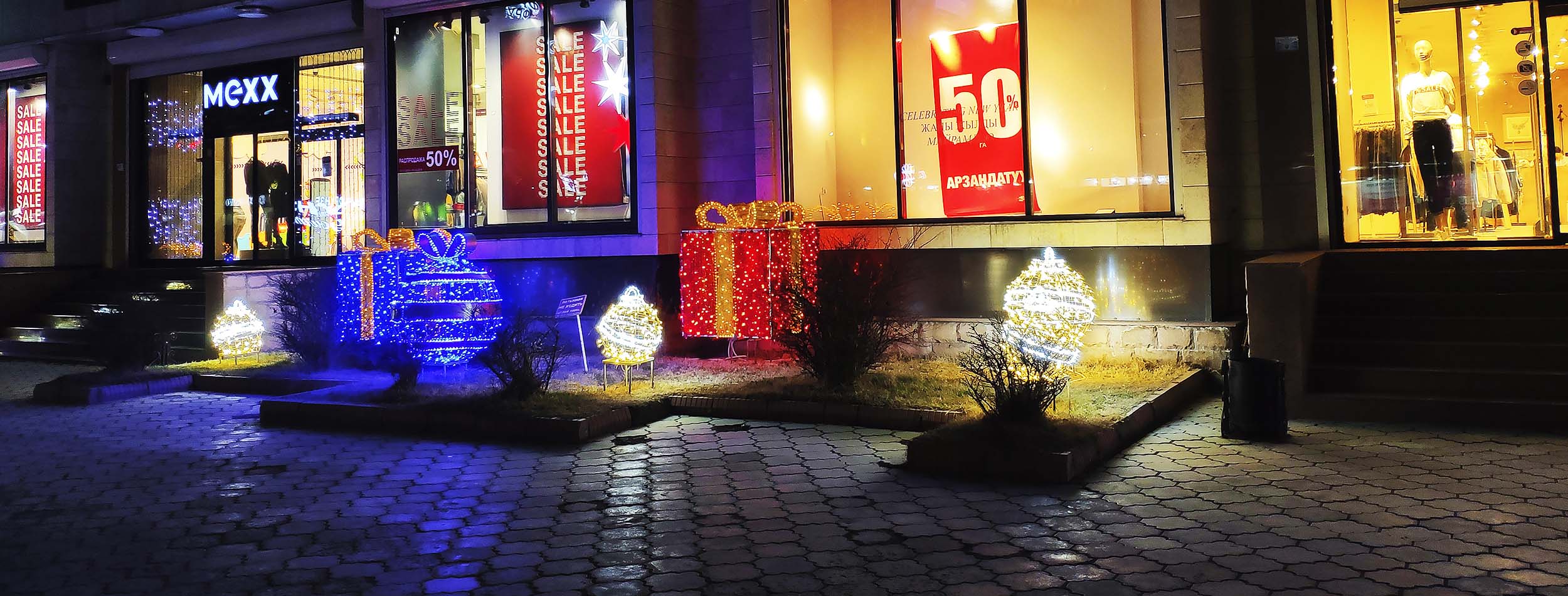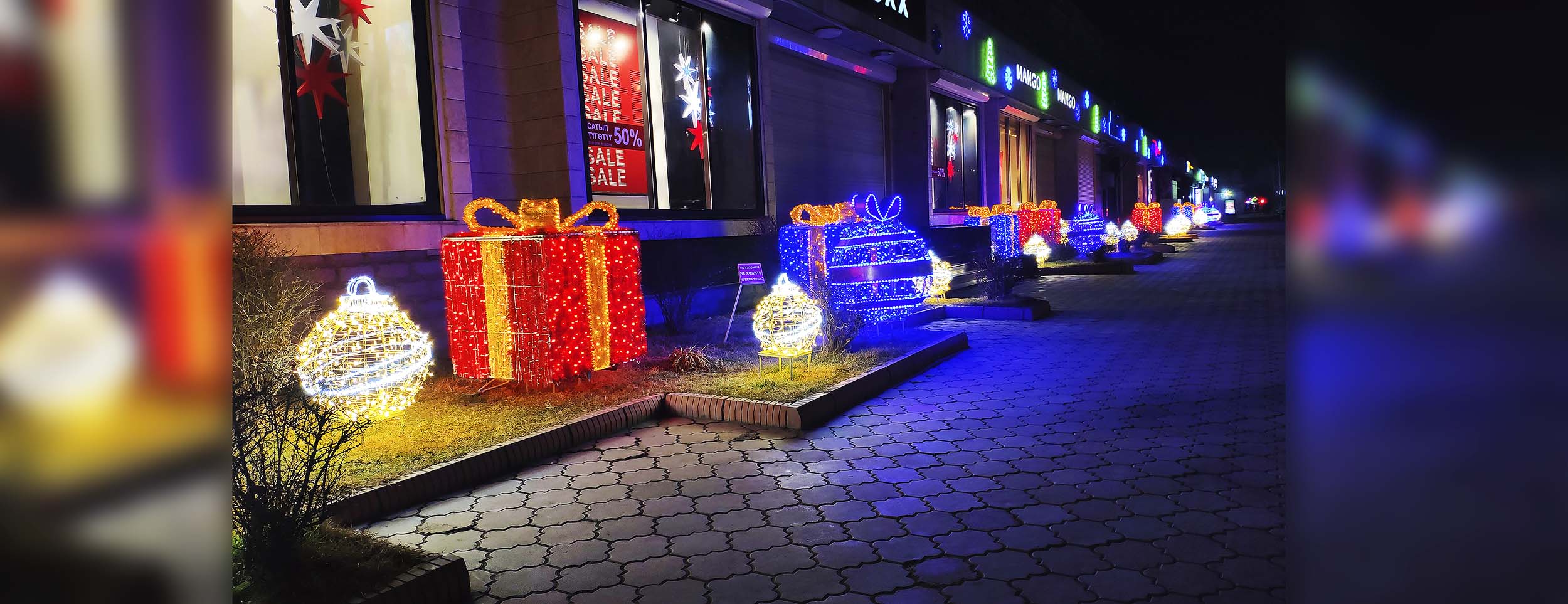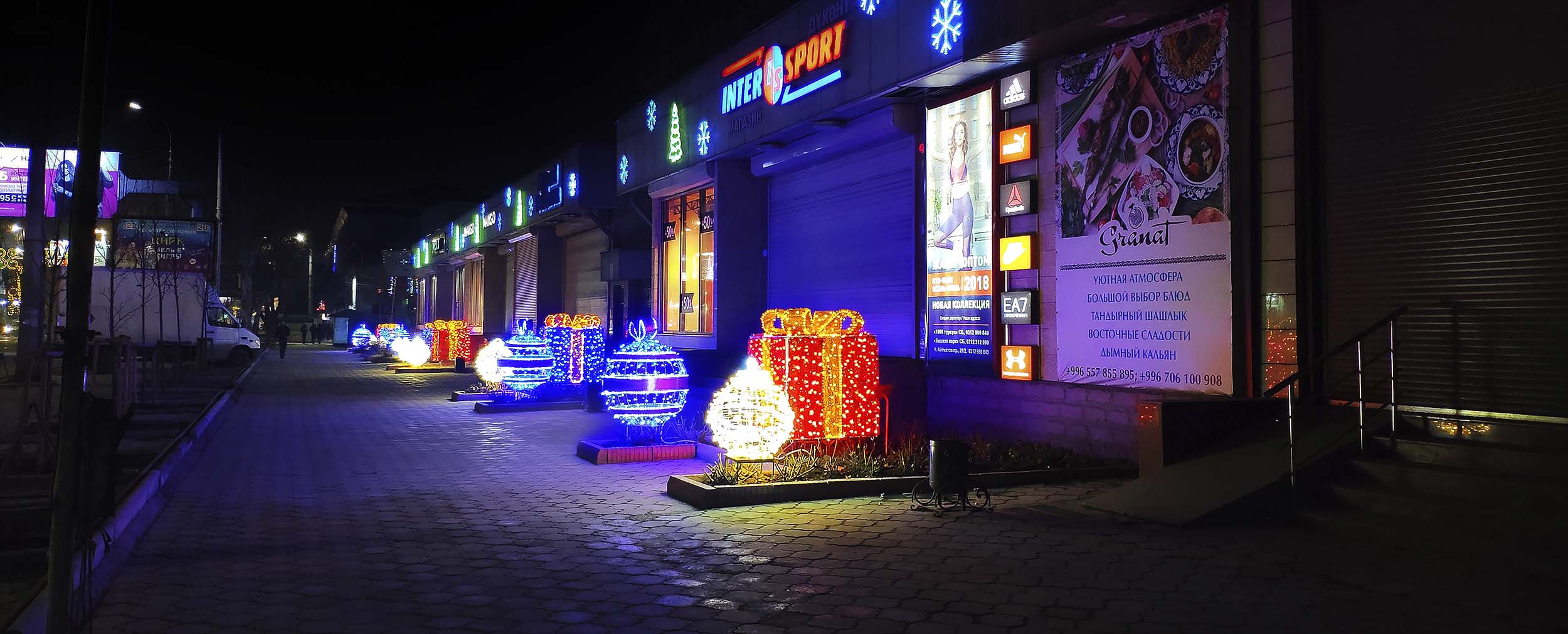 В 2018г. нашей компанией выполнено праздничное новогоднее украшение ТЦ «1000 мелочей» в г. Бишкек. Установлены декоративные конструкции в форме подарков и шаров со светодиодной подсветкой.